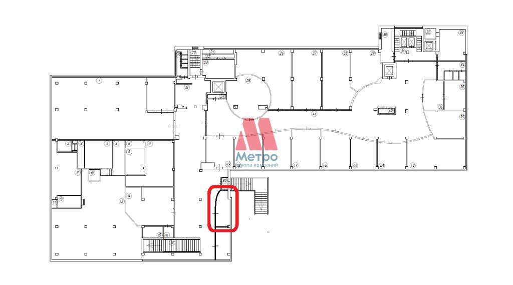 На внутреннем трафике бизнес-центра, рядом со внутренним входом в Магнит. На техплане выделен красным контуром.