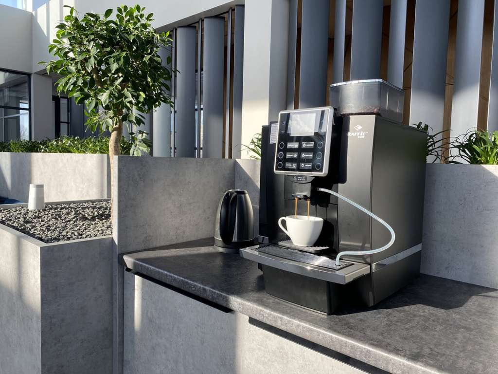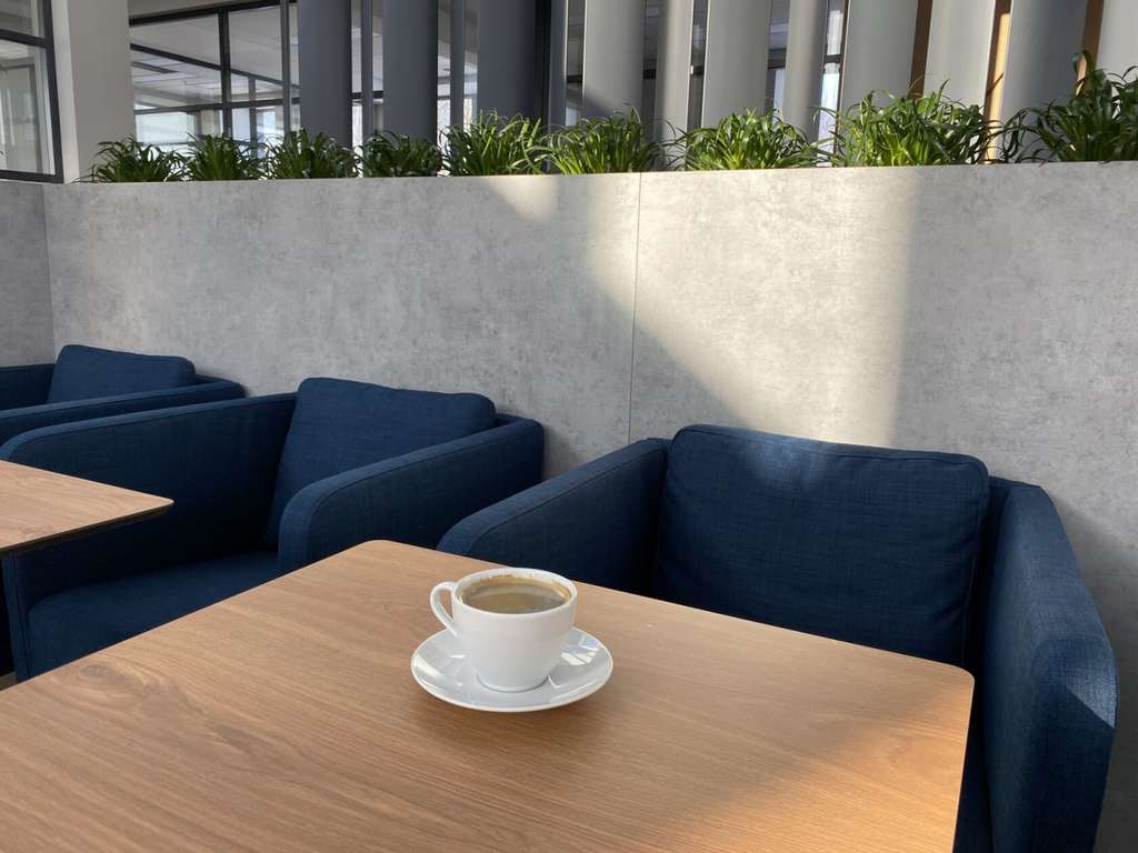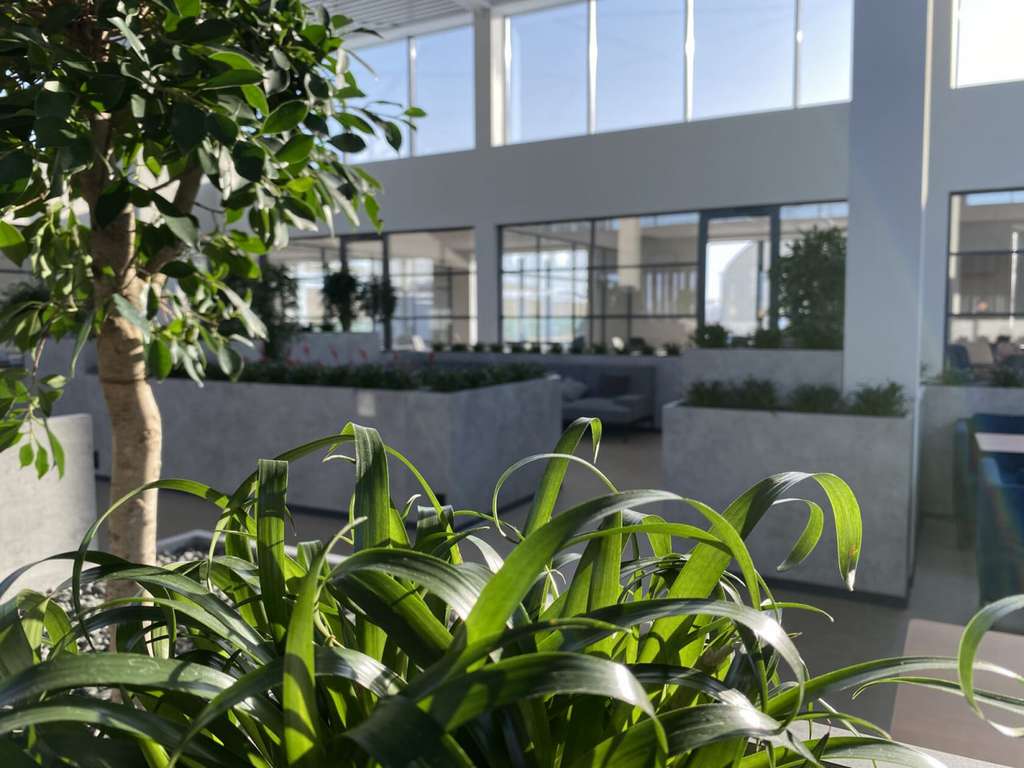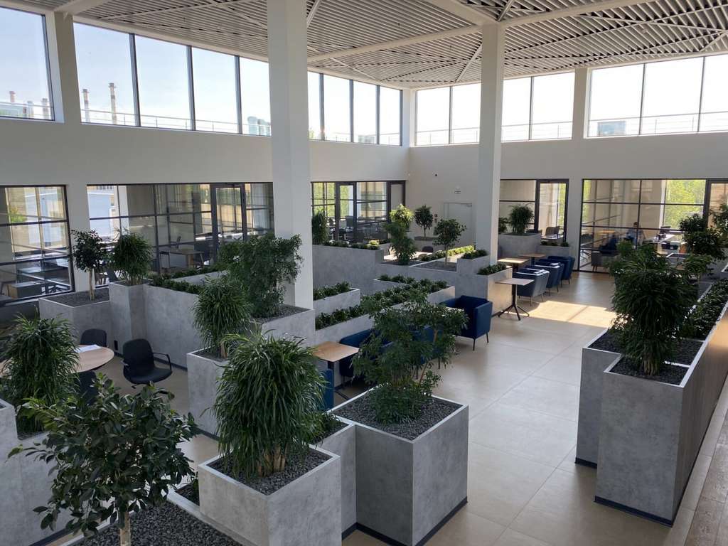 Лаунж-холл с панорамным остеклением и дизайнерским растительным ландшафтом наполнен естественным цветом и включает в себя зоны для переговоров и кофе-брейка.