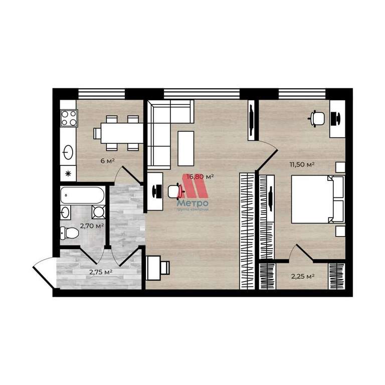 Общая площадь: 42,8 м.