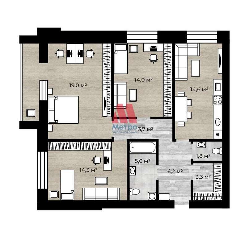 Количество комнат: 3 Общая площадь: 81,9 м , просторная кухня-гостиная 14,6м2. Этаж: 1/3