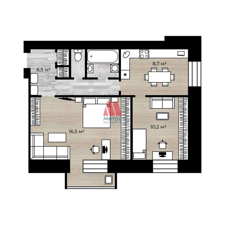 -комнаты 10.2+16,5 кв. м., вместительный коридор 6,5 кв. м. ;