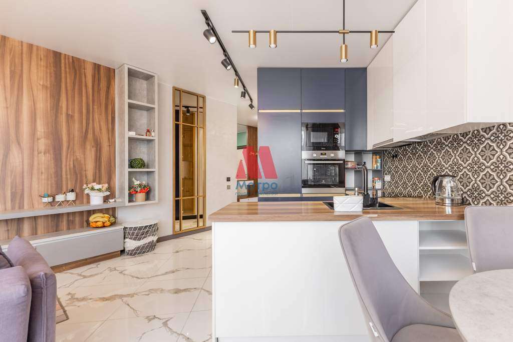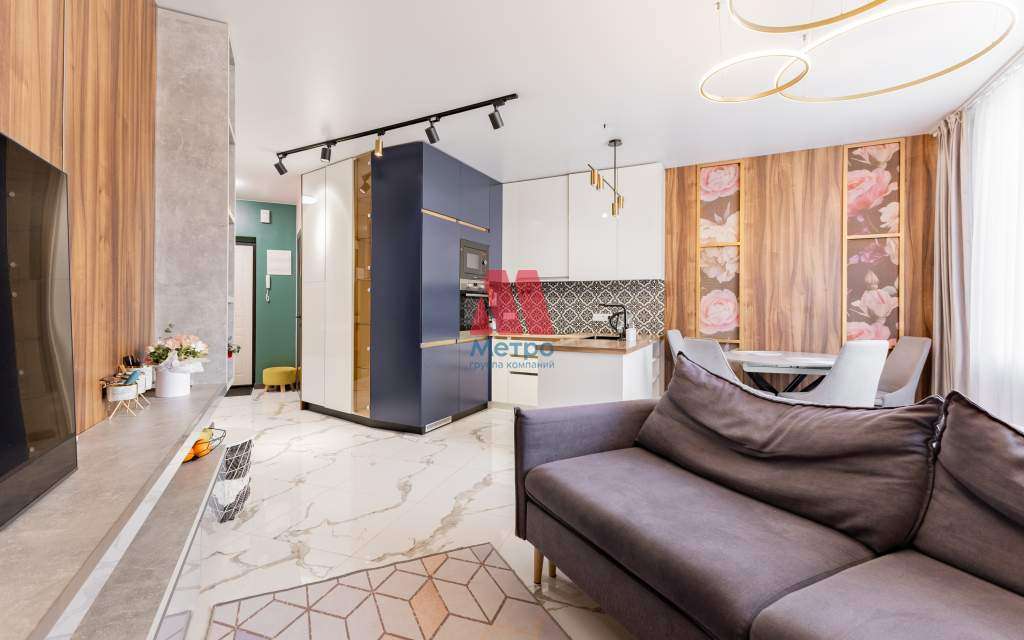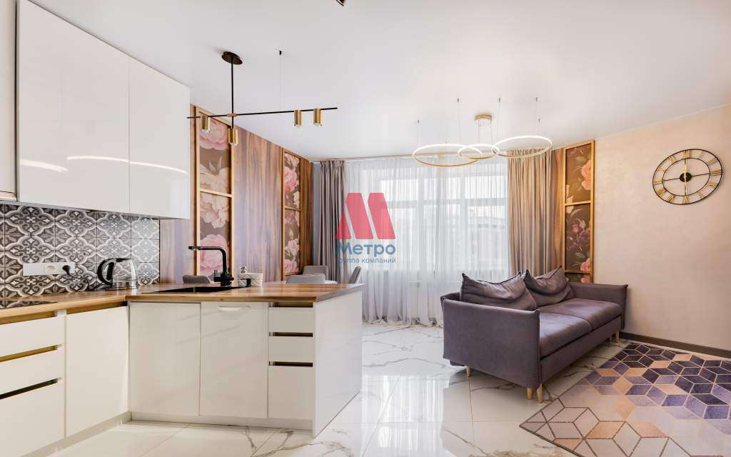 - просторная гостиная зона с функциональной стильной кухней с втроенной техникой (посудомоечная машина, микроволновка, холодильник, чайник, духовой шкаф) ;