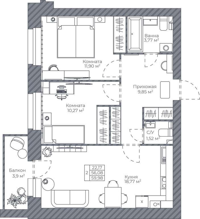 В ЖК «Домашний» продаётся 2-комнатная квартира площадью 59,98 кв. м. с отделкой white box. Квартира расположена на 5 этаже в жилом комплексе комфорт-класса Домашний (срок сдачи 3 квартал 2027г)