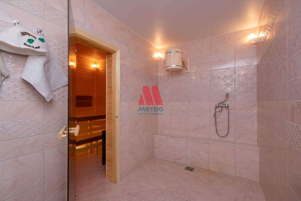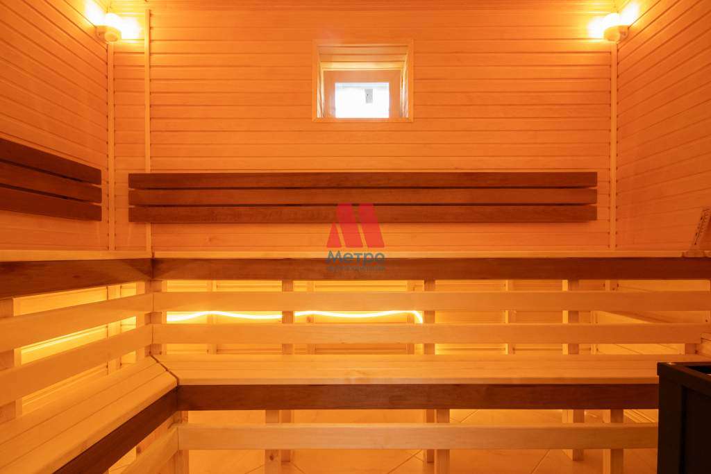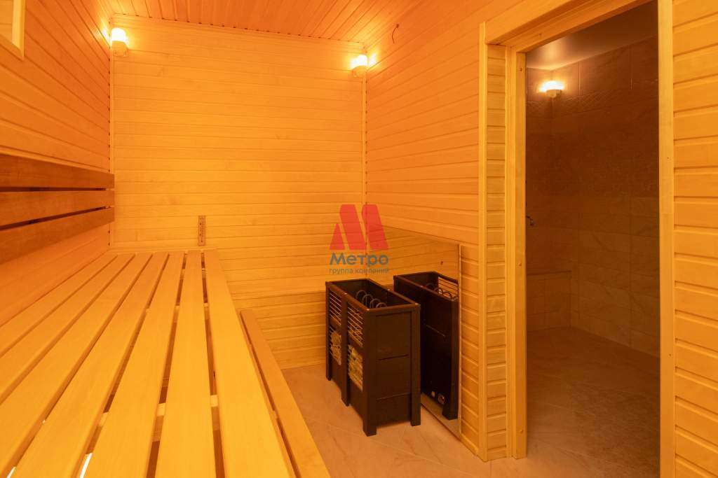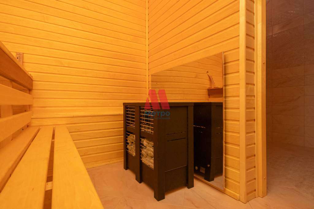 На первом этаже расположены кухня 15 кв. м, гостинная 42 кв. м, большой сан. узел 10 кв. м. и особое место занимает сауна с печью, отделка осина, которая полностью готова к эксплуатации. На втором этаже сан. узел 9 кв. м гардеробная 5 кв. м и три комнаты 15,15 и 25 кв. м.