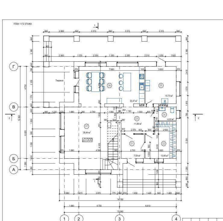 Первый этаж - просторная кухня-столовая 33,4 м с выходом на террасу, гостиная 38,4 м с панорамными окнами, отдельная спальня, большая гардеробная, техническое помещение, санузел.