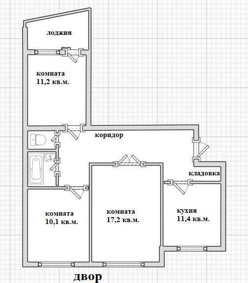 Комнаты изолированные: 17,2 кв. м., 11,2 кв. м., 10,1 кв. м. Кухня квадратной формы 11,4 кв. м., санузел раздельный, установлены приборы учеты, есть просторная застекленная лоджия, имеется кладовое помещение при входе, можно переоборудовать в градеробную.